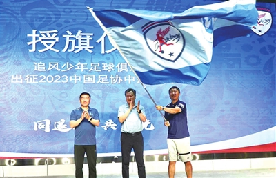 本报6月16日讯 16日下午,青岛追风少年足球俱乐部在位于莱西市的青岛宏远健康颐养中心举行了2023赛季中国足球协会会员协会冠军联赛出征仪式。标志着这家从2016年成立至今已经扎根莱西7年的足球俱乐部将正式踏上中国足球联赛的舞台,同时,“同追风,共荣光”的口号也让他们满怀信心地迎接全新的机遇和挑战。