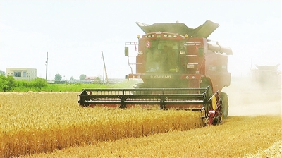 在位于李哥庄南部11个村庄现代农业示范区农业万亩麦田收割现场,伴随着隆隆的轰鸣声,10台凯斯、约翰迪尔等大型进口收割机在田间来回穿梭。一行行麦穗被卷入收割机中,收割、脱粒、除杂,一气呵成。“我们一台机器的收割效率可达到一天300—400亩,预计6月20日前可全部收割完毕。”现场收割农技人员喻雷告诉记者。
