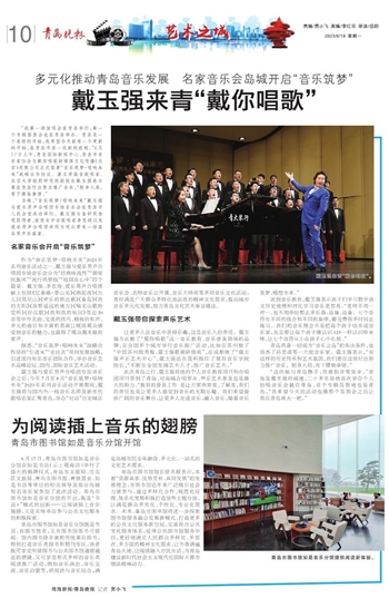 戴玉强与爱乐男声合唱团专场音乐会之后,今年7月至8月“音乐筑梦·唱响未来”2023年系列音乐活动开展期间,戴玉强将与国内外一线音乐名师及新生代歌唱名家汇聚青岛,举办“对话”历史城区音乐会、名师音乐公开课、音乐大师班等多项音乐文化活动,更好满足广大群众多样化高品质的精神文化需求,推动城市音乐多元化发展,助力青岛文化艺术事业建设。