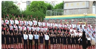 学校全体党员教师与学生代表共同唱响《追寻》表达爱党爱国之情。韩星 摄