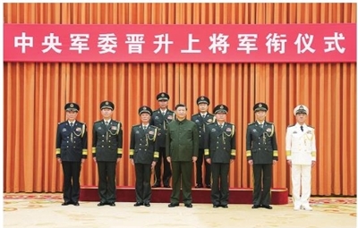 晋衔仪式在嘹亮的军歌声中结束。随后,习近平等领导同志同晋升上将军衔的军官合影。