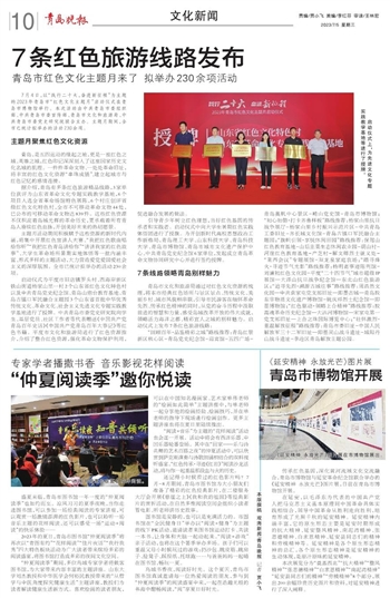 7月4日,以“践行二十大,奋进新征程”为主题的2023年青岛市“红色文化主题月”启动仪式在青岛市博物馆举行。本次活动由中共青岛市委组织部、中共青岛市委宣传部、青岛市文化和旅游局、中共青岛市委党史研究院联合主办。主题月期间,全市已统计拟举办的活动230余项。