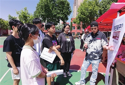 应届毕业生张文博(右一)为学弟学妹们介绍工作岗位。