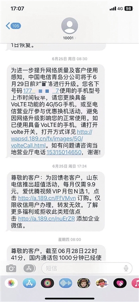 事后,刘先生在短信中发现了中国电信6月25日8时30分发送的一条短信,称6月29日前对网络升级,因使用手机型号上市时间较早,需更换具备VoLTE功能的4G/5G手机,或到电信营业厅参与优惠换机活动。