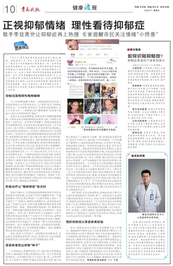 7月5日,歌手李玟离世的消息让许多人难过、惋惜。在歌迷的心中,李玟一直是位面带笑容的“女战士”,她为这个世界奉献好心情到最后一刻。在李玟姐姐发布的微博中,众人才得知,乐观开朗的李玟其实深陷抑郁症,让她备受煎熬。一时间,抑郁症再度成为关注焦点,又一次冲上热搜,同时阳光型抑郁症也被屡屡提及。加之,近年来被爆出患有抑郁症的明星、名人,让人们不禁会想,抑郁症是否就在身边?其实,抑郁情绪和抑郁症并不相同,生活中正视抑郁情绪、理性看待抑郁症同等重要。对此,记者采访了青岛市精神卫生中心心身医学科主任孙波、市南区竹蜻蜓社会工作中心负责人王竹君。