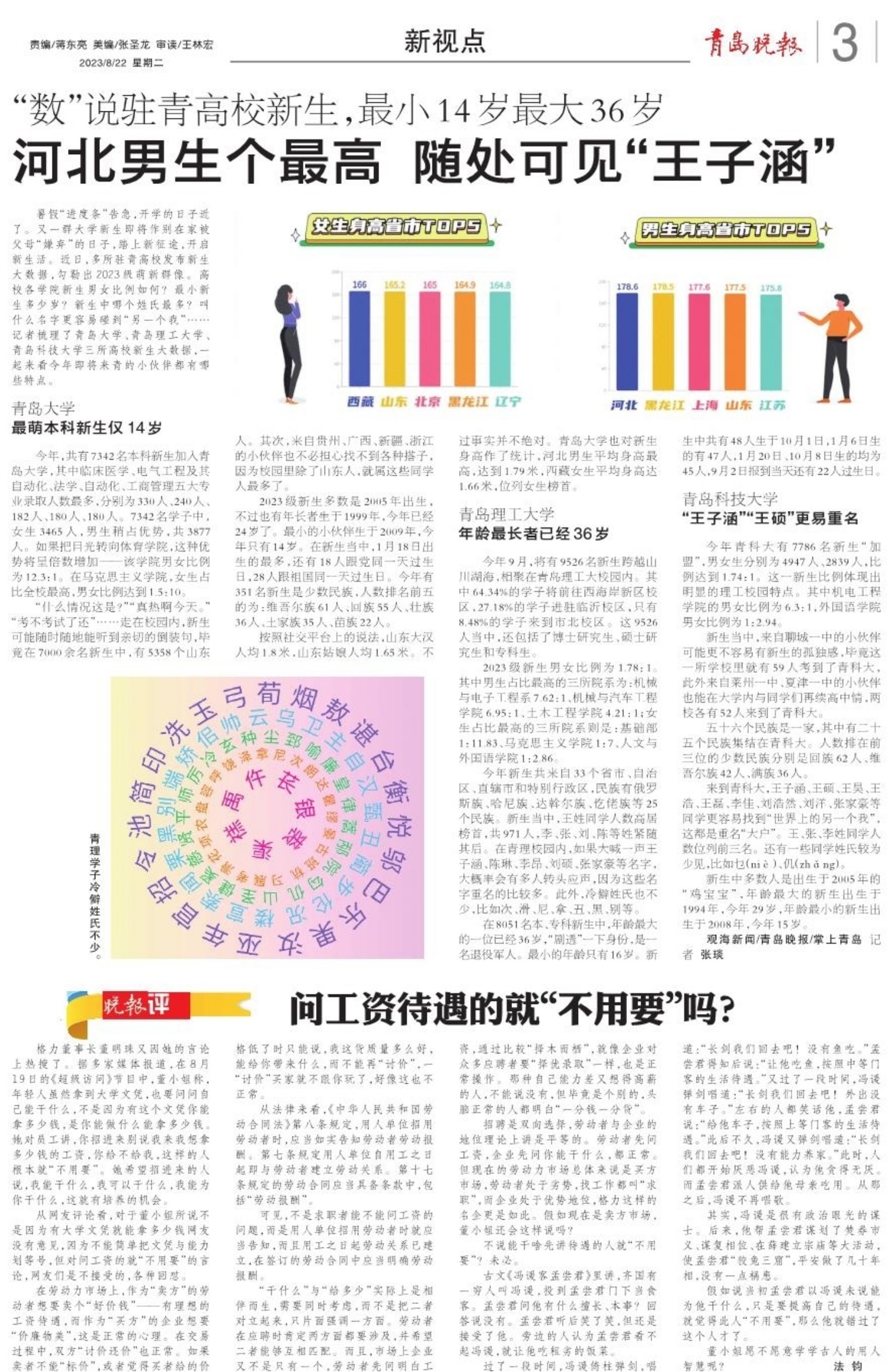 暑假“进度条”告急,开学的日子近了。又一群大学新生即将作别在家被父母“嫌弃”的日子,踏上新征途,开启新生活。近日,多所驻青高校发布新生大数据,勾勒出2023级萌新群像。高校各学院新生男女比例如何?最小新生多少岁?新生中哪个姓氏最多?叫什么名字更容易碰到“另一个我”……记者梳理了青岛大学、青岛理工大学、青岛科技大学三所高校新生大数据,一起来看今年即将来青的小伙伴都有哪些特点。