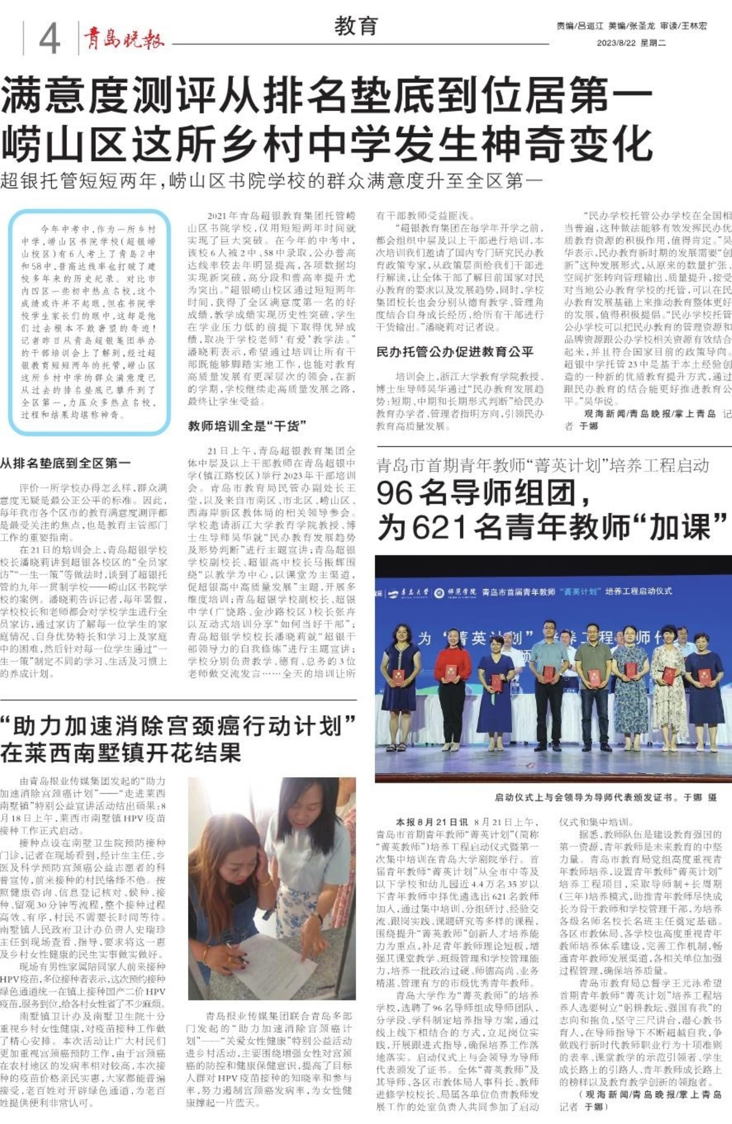 今年中考中,作为一所乡村中学,崂山区书院学校(超银崂山校区)有6人考上了青岛2中和58中,普高达线率也打破了建校多年来的历史纪录。对比市内四区一些初中热点名校,这个成绩或许并不起眼,但在书院学校学生家长们的眼中,这却是他们过去根本不敢奢望的奇迹!记者昨日从青岛超银集团举办的干部培训会上了解到,经过超银教育短短两年的托管,崂山区这所乡村中学的群众满意度已从过去的排名垫底已攀升到了全区第一,力压众多热点名校,过程和结果均堪称神奇。