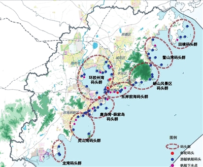 8大码头群:田横码头群、环胶州湾码头群、鳌山湾码头群、唐岛湾—薛家岛码头群、崂山风景区码头群、灵山湾码头群、东岸前海码头群、龙湾码头群