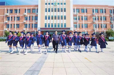 莱西市济南路小学王忠辉校长和毕业生一起走向未来。