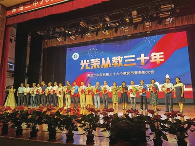 伴随着校交响乐团的一曲《炎黄风情·国乐礼赞》庆祝暨表彰大会拉开帷幕。师者,言传身教,春晖四方;师者,提灯引路,育梦成光。从酷暑到严寒,从青涩到成熟,教龄满10年的教师为二中发展奉献了风华正茂。二十年回首来路,朝霞和黎明记录了点滴,星辰和夜空记录了脚步,教龄满20年的教师为学校播撒了太多心血与汗水。三十年光阴磨一剑,三十年身心献杏坛,从过去的意气风发,到如今的华发早生,悠悠三十载,大道如砥,师者无疆,教龄满30年的教师是青岛二中辉煌历史的奠基人与见证者。伴着赞歌,从教满30年的教师走上颁奖台,王先军为他们颁奖,书记李洁为他们授花。作为教师代表董天龙表示,回首从教以来走过的近四十载岁月,往事历历在目,从未改变的是初心如磐,秉承仁爱、专业的教育信条,把教育工匠精神作为自觉的教育信念。