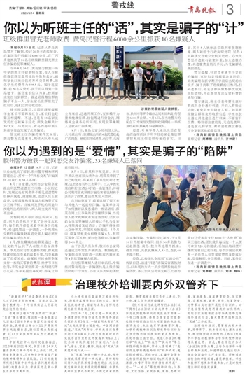 本报9月13日讯 9月13日,记者从公安机关了解到,胶州警方精准研判雷霆出击,打掉一个“网恋交友”诈骗团伙,目前已有33人落网。