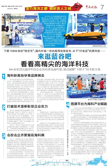 青岛蓝谷全力推动涉海优质科研项目落户,累计汇聚了国家深海基地、山大青岛校区、北航科教新城等“国字号”科研机构、高校院所50余家,各类科技创新平台70余个,在蓝谷形成了科研“大脑”聚集、科技“效应”叠加的良好发展态势。蓝谷结合自身发展基础,加快推动海洋科创优势向新兴产业布局,确定了海洋高技术服务、海洋生物、海洋高端装备3个新兴产业和海洋文旅、涉海总部经济2个特色产业的“3+2”产业体系,对应布局建设海洋生物、海洋高端装备(鳌山卫片区、温泉片区)、海洋信息四大千亩产业园区,加大海洋领域项目招商和科技成果转化,推动海洋产业规模化集聚化发展。