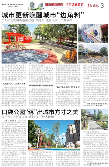 本报10月16日讯 今年以来,胶州市结合城市更新和城市建设三年攻坚行动,新改建城市绿道12.6公里,实施文昌阁路、胶平路等6条林荫廊道建设,新改建胶州公园等3处综合公园,上河城口袋公园、紫薇路口袋公园等5处口袋公园。重点打造云溪河、护城河两河历史文化公园,融入文化、运动、便民等要素,让公园融入城市、让文化融入血脉,逐步实现居民“推窗见绿、出门入园”的美好生活愿景,为老城区注入新活力。截至目前,5个新建口袋公园全部完工并向市民开放,老百姓家门口的好去处越来越多。
