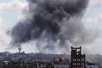 10月15日,加沙地带南部城市汗尤尼斯的建筑遭以色列军队空袭后升起浓烟。新华社发