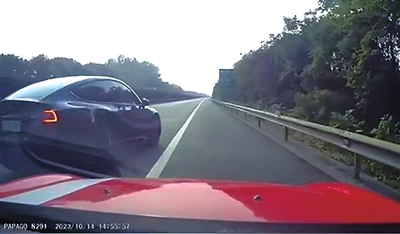 特斯拉在高速上别停红车。(截图)