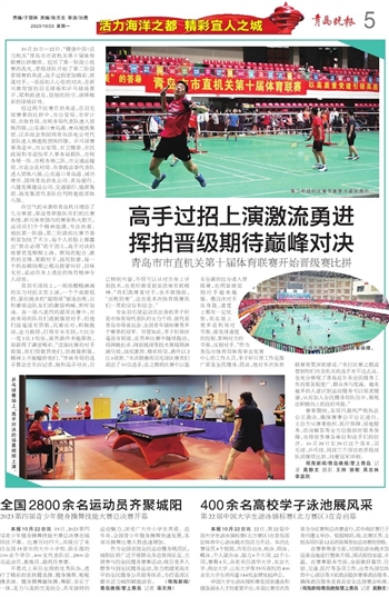 本报10月22日讯 22日,第22届中国大学生游泳锦标赛(北方赛区)在青岛国信体育中心游泳跳水馆活力开启。本次比赛设置4个组别,共有自由泳、蛙泳、仰泳、蝶泳、个人混合泳、接力6个大项、22个小项,赛期4天,共有来自清华大学、北京大学、南京大学、山东大学等55所高校的400余名大学生将向着144枚金牌发起冲击。