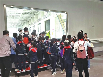 小记者紧接着参观了小涧西康恒生活垃圾焚烧厂。“这里太炫酷了。”看到蜂巢状的厂区外形,小记者们不禁惊叹。厂区室内的重头戏更是让小记者流连忘返。“透过一层玻璃我们可以看到数几十米高的垃圾仓,像《变形金刚》里的大钢铁爪子‘垃圾吊’,抓取仓内垃圾投入焚烧炉进料口,送至炉膛内进行燃烧。”工作人员介绍,这里一天可入炉焚烧垃圾近2000吨,产生的热量用来发电,全年发电量够20万户家庭使用一年。