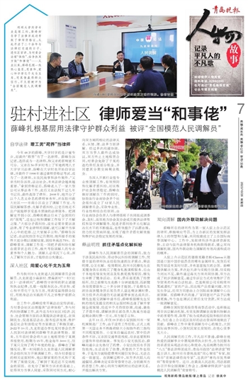 作为胶州市九龙街道人民调解委员会调解员、九龙街道少海新村、营海新村“一村(社区)一法律顾问”,薛峰恪守律师的职业道德和执业纪律,扎根一线服务民众,用亲和、爱心和辛劳化干戈为玉帛,用真情赢得群众信任,用躬身法治实践的平凡之举维护着群众利益。