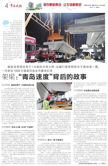 在经验老到的负责团队带领下,一支平均年龄30岁的架梁团队用技术和奉献精神架起了青岛最大规模的装配式预制市政道路,也刷新了箱梁架设的青岛纪录。