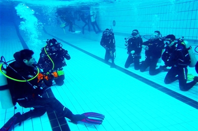 徐天翔(左一)和同事们在练习潜水。