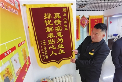 位于君峰路的康太源·尚誉小区物业办公室里挂着一面锦旗。物业项目经理曹海波告诉记者,这是家住一号楼的居民张老太赠送的。