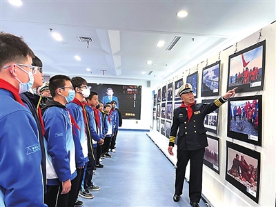 海军潜艇学院原副教授李本江(右)为同学们讲解中国首次赴南极护航科考图片展。 张琰 摄