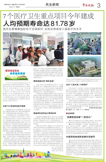 青岛市深化“三高共管、六病同防”医防融合慢性病管理试点,将“高血压、高血糖、高血脂”和“慢阻肺”高危人群及并发症筛查纳入2023年市办实事。截至10月底已为19.3万名“三高”患者提供一体化服务,开展“三高”并发症筛查38.7万人,糖尿病易患人群检测71.5万人,慢阻肺问卷调查249.9万人。今年全市新增托位8674个,总数达到35499个,每千人口托位数3.43个。
