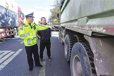 民警在火炬路设卡查车,要求大货车司机守法行驶。刘卓毅 摄