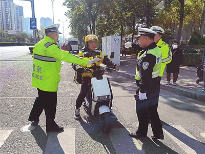 执勤民警告诉记者,这一路口周边分布着多个小区,除此之外,还有世茂52+、金茂览秀城等大型城市综合体,周边还有很多小吃店,很多外卖骑手为了抢时间,会试图“挑战”交通法规。上午10时许,民警在路口北向南的车道上,拦下了一名向北逆行的电动车骑手。