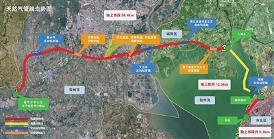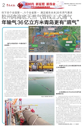 青岛市胶州湾海底天然气管线项目总投资14.5亿元,自2021年12月30日正式启动,于2022年12月完成主线建设。管线自中石化东干线胶州分输站起,途经胶州市、城阳区,从女姑口大桥西入海,经镇平路调压站上岸后,与市区“三横四纵”次高压燃气管线对接,并向南延伸至华电青岛发电厂,可满足沿途上合示范区、高新区以及东岸城区大型燃气发电项目、“煤改气”工程的用气需求。