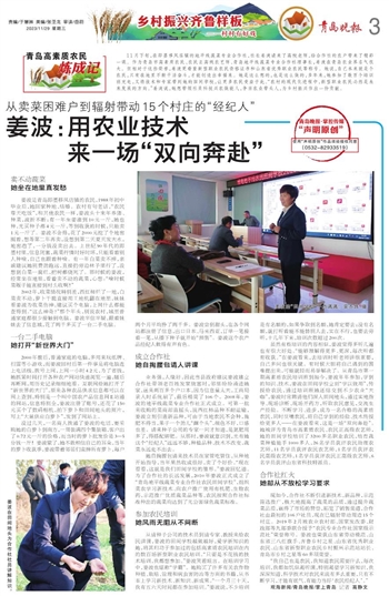 没过几天,一名商人拨通了姜波的电话,要采购她的白萝卜到南方,一周装满四个集装箱,客户出了0.72元一斤的价格,而当时的萝卜批发价是3—5分钱一斤!姜波蒙了,她不敢相信自己的耳朵,当年的萝卜收获季,姜波带着邻居们卖掉所有萝卜,每户两个月平均挣了两千多。姜波尝到甜头,在各个网站都注册了信息,出口日本、马来西亚,订单一笔接着一笔,从播下种子就开始“预售”。姜波这个农产品经纪人做得有声有色。