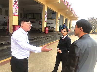岳子平(左一)与检察官和燃气站工作人员探讨公益诉讼相关问题。