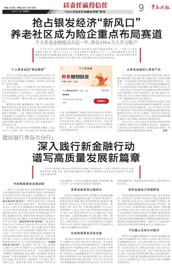 坚持“大众金融”理念,把金融科技作为新金融行动的重要支撑,以技术和数据为驱动,持续增强科技支持能力和客户服务能力,在搭建平台、培育生态、赋能社会的过程中打造高质量发展新优势。升维支持实体“新范式”。聚焦支持稳外贸,打造场景化、可视化、数字化“跨境+境内”一体化综合金融服务平台,以数字化手段破解传统贸易融资难题,铺设“走出去”数字化快车道;与自贸区管委共建自贸金融创新实验室,依托“数字仓库”和“跨境电商”平台嵌入金融服务场景,围绕贸易链、物流链、创新链、生态链布局和打造金融链,以新金融实践助力青岛高水平对外开放。赋能营商环境“新体验”。建设银行青岛市分行与青岛市行政审批局共同打造“青岛市企业开办智能一体化平台”,嵌入金融、政务多场景应用,实现了企业开办审批整个流程仅需1个环节“办好”、1个工作日“办结”的便民体验;积极助力青岛税务局落实国家“便民办税春风行动”,打造全国首个数字人民币“全渠道无感”纳税缴费场景,协同推进政务信息化,助力营商环境持续优化。共建数字经济“新生活”。依托建行“双子星”平台,创新提出“建行生活N+生活圈”打法,持续释放惠民红利,引领岛城居民数字时代新生活。与青岛崂矿集团“刺猬网”、能链集团“团油APP”、地铁集团“青岛地铁APP ”共建双向赋能平台,打造“金融+非金融”便民生态圈;支持青岛市“智慧物业”平台建设,嵌入“建行生活”、装修分期、快贷、养老金账户等多元化的金融服务,为市民安居提供全覆盖、更智慧的“建行方案”,全方位提升岛城居民幸福指数。