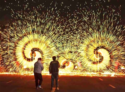 栩栩如生的糖画艺术,金丝银线精雕细琢的铝艺,西施豆腐,油纸伞……以及各种精彩的杂技表演吸引着一波波的游客。作为中国民族的传统文化非遗项目,打铁花表演成为了青岛明月山海间首届渔灯火把节的又一亮点,让大家感受山东民俗文化的深厚底蕴。