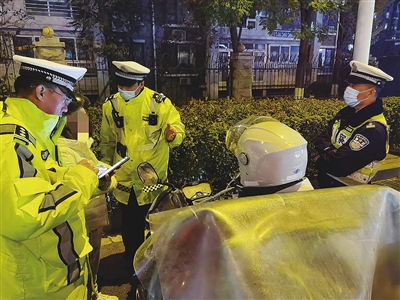 6日晚9时50分许,带班副中队长王海滨发现,一辆三轮车行驶到卡点时,似乎有些犹豫。王海滨没有贸然上前拦截,站在原地等着三轮车慢慢驶入检查区。“来,停一下。”王海滨伸手将其拦住,可骑车男子装作没看见,试图加速往前冲,其他交警立刻上前将其拦下。