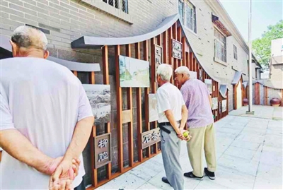 老居民在湖岛记忆——社区广场的文化墙上寻找过去的岁月。