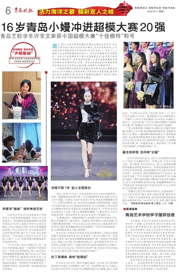 近日,第十七届中国超级模特大赛总决赛在北京举行,来自全国50余个省市自治区的分赛区、百余所院校机构、上千位报名者中选拔出的132位选手(其中女生81人,男生51人)集结于北京龙熙维景国际会议中心,争夺总决赛最后的40强席位。经过4天选拔排练和1整天的高强度比拼,在评委们激烈讨论和严格把控下,最终选拔晋级第十七届中国超级模特大赛总决赛女生20强和男生20强。青岛艺术学校2023级服装表演专业学生许宝文晋级女生前20强,并荣获"十佳模特"称号。