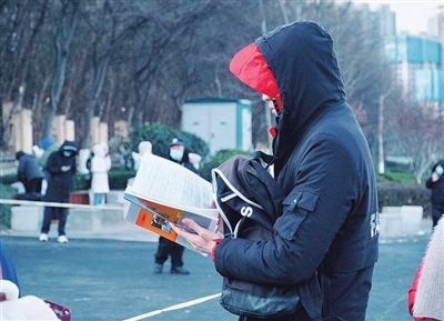 零下6摄氏度,考生穿着厚厚的羽绒服,手里捧着复习资料。12月23日清晨6时30分,天空刚刚泛起鱼肚白,青岛二中考点已有考生出现,抓紧最后的时间复习。