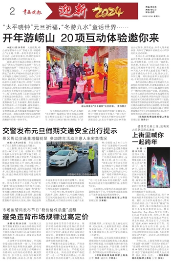 本报12月29日讯 元旦假期,崂山游客服务中心以“喜迎元旦,福道崂山”为主题,开展一系列丰富多彩的文化活动,让游客在喜庆、热闹的氛围中感受浓郁的崂山历史和民俗文化。