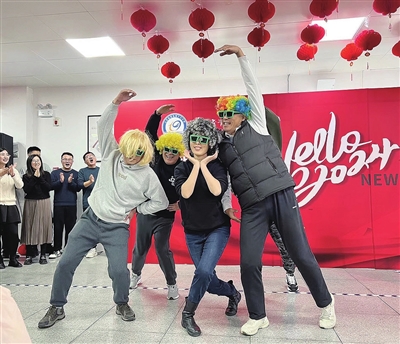 “学校年轻老师比较多,他们喜欢‘动起来’的节目。我们就想到了跳舞,选的这首曲子很欢乐,而且我们特意做搞笑打扮,跳错了也看不大出来,还有喜剧效果,让老师们哈哈一乐。”周强笑称,他们成了教工元旦联欢会上的五个“显眼包”。为了“台上三分钟”,他和同事们利用零星的时间加紧训练,并集体排练了五次。