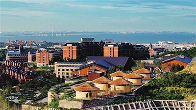 在龙斗山修复过程中,中德生态园以保护山体林地生态系统结构和功能完整性为基础,确定在山体北麓打造一家绿色酒店——青岛红石秀景大酒店。酒店以保护山体林地生态系统结构和功能完整性为基础,整体设计尊重原有地貌肌理,充分利用场地高差,精准确定建筑分层(段)以及山体台地改造利用方案,将建筑主体与山体融为一体。