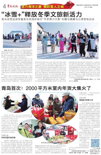 据统计,藏马山滑雪场自本季开板以来,已累计接待游客3万余人次,掀起冰雪旅游的热潮,全面提升新区“体育+旅游”的吸引力和影响力,助力打造“体育之城、活力新区”的崭新名片。青岛西海岸新区“冬季黄河大集”同时启动,此次“黄河大集”活动为期3个月,以成果展示、文化发掘、消费拉动为重点,通过直播带货、民俗表演、特色展销、非遗展演等形式,开展50余项重点活动,持续营造浓厚氛围,传递节日快乐。“冰雪巡游季和冬季黄河大集期间,我们联合辖区文旅企业,融合休闲度假、体育运动、民俗节庆、宜居康养、农业采摘等业态,筹备策划冰雪旅游季、藏马山新春大庙会、阿朵花屿上元灯会、草莓采摘以及特色乡村游等系列文旅活动,力争给游客朋友们带来丰富的游玩体验。”藏马镇党委宣传统战委员刘华琼介绍。
