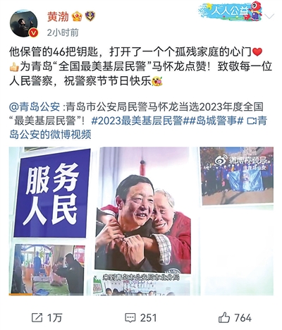 “他保管的46把钥匙,打开了一个个孤残家庭的心门。为青岛‘全国最美基层民警’马怀龙点赞!致敬每一位人民警察,祝警察节节日快乐!”当天上午,青岛籍著名演员黄渤在微博上转发了马怀龙的事迹,为他点赞,致敬人民警察——早在24年前,在青岛拍摄的电视剧《黑洞》中,时年26岁的黄渤就饰演过一名见习警官。