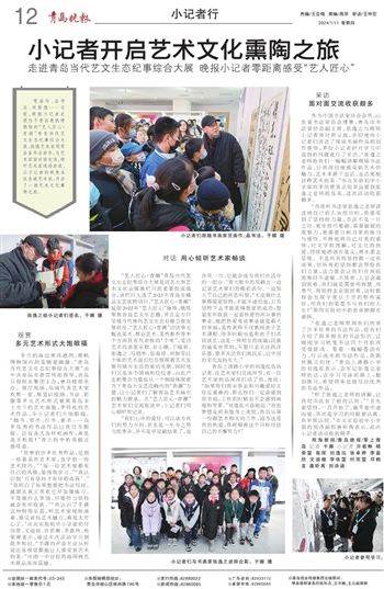 “艺人匠心·青潮”青岛当代艺文生态纪事综合大展是同名大型艺术文化全媒体栏目的重要组成部分,该栏目入选了2023年青岛市精品文艺扶持项目。“艺人匠心·青潮”延续2022年“艺人匠心”脉络,继续聚焦青岛艺文生态圈,并且全方位呈现当代青岛艺文生态后继力量发展状况。“艺人匠心·青潮”访谈单元甄选美术、舞台艺术、美育教育等多个方面具有代表性的“个案”,受访艺术代表张乐群、孙小娥、于晓君、张逸之、马艳彬、张海珍、刘伽等以个体的艺术成长经历展现着艺术发展与城市生活的密切关联,同时他们又是各个领域的佼佼者,由此产生的聚合力量也从一个侧面体现着当下青岛大文艺范畴内的“青潮”力量,让小记者们了解青岛艺术城市的魅力源泉。在“艺人匠心·青潮”艺术家们交流座谈中,小记者们用心倾听和记录。