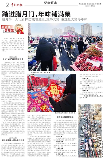 当天的流亭大集年味十足,数千家摊位沿道路两侧一字排开,流亭大馒头、流亭猪蹄、胡氏卤水豆腐琳琅满目,吃的、穿的、用的一应俱全。最具人气的还当属福字、春联摊位,鲜艳喜庆的挂饰摆件、火红的灯笼迎风起舞,喜迎新春。“没想到今天人这么多,大家都喜欢的龙年福字没备够,还有几个腊月大集,我得多备点货。”大集上的老摊主胡先生说。