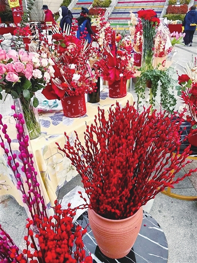 除了买吃的之外,过年少不了要买一些摆件,年宵花是不错的选择。黄河大集上,新加入的年宵花摊位吸引了不少居民驻足购买。摊位虽然不大,但是种类齐全,银柳、北美冬青、大花蕙兰以及缤纷的福桶,都给大集增添了喜庆的年味。
