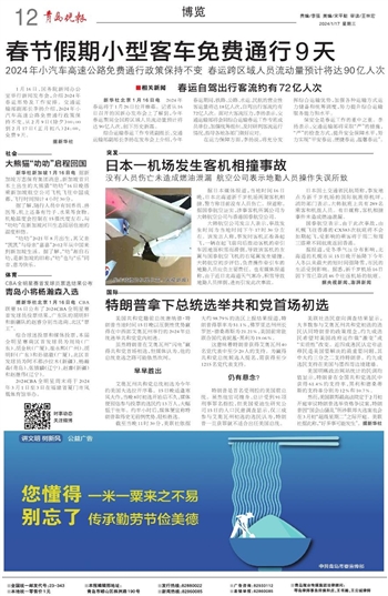 1月16日,国务院新闻办公室举行新闻发布会,介绍2024年春运形势及工作安排。交通运输部副部长李扬介绍,2024年小汽车高速公路免费通行政策保持不变,从2月9日(除夕)00:00到2月17日(正月初八)24:00,免费9天。