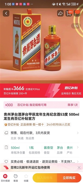 记者在淘宝平台上搜索“龙茅”,出现了大量相关产品。名为“百亿补贴官方频道”的卖家龙茅售价为3666元,相比官方指导价高出1167元,百亿补贴官方频道销售的“龙茅”为预售,付款后三天内可以发货,页面显示目前已经有超过100人付款购买。