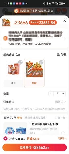 一家名为安徽乾瑞名酒收藏拍卖店的商家不仅销售单瓶“龙茅”,甚至可以销售整箱“龙茅”,并且全部为现货。该商家单瓶“龙茅”售价3599元,整箱“龙茅”售价23666元。