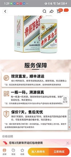 “龙茅”的火爆也带火了茅台往年推出的生肖酒。一家名为老酒文化馆的商家上架了龙、兔、虎、牛、猴、羊、马等茅台生肖酒,其中羊年生肖茅台售价高达31999元,马年生肖茅台售价达21999元。该商家在产品描述中特别说明了服务保障,所有货品将采用现货直发,顺丰速运,一瓶一码,溯源保真,保价7天,售后无忧。